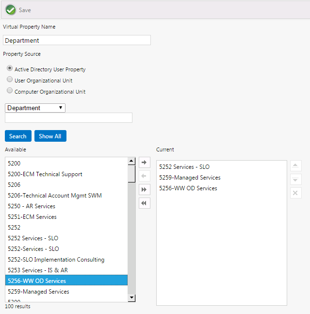 - Computer Organizational Unit —Select this option to extract values from a Computer Organizational Unit. When you select this option, a tree view of Organizational Unit s will be displayed in the Available area. Click and drag to move properties from the tree to the Current list.
