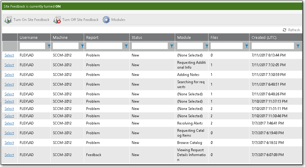 - To view the details of a feedback submission, click Select next to the feedback issue you want to view. The Feedback Details view opens, displaying both the text of the submitted feedback issue and a list of the files that were uploaded with the feedback issue.
