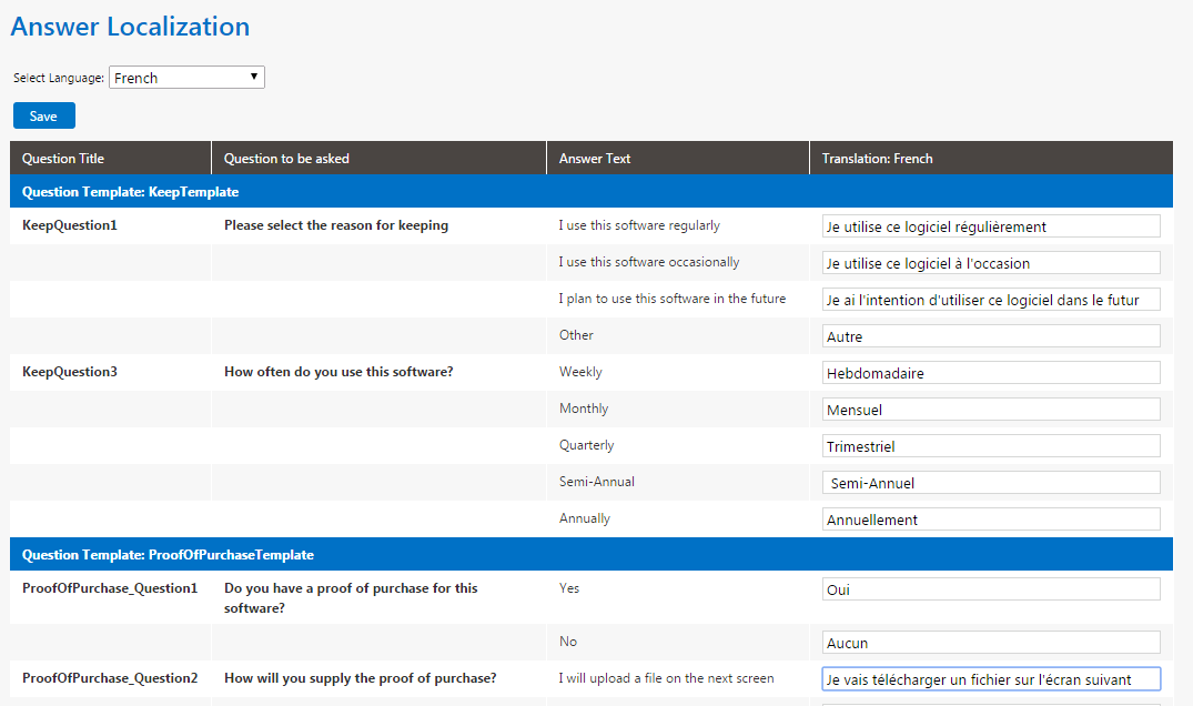 - From the   Select Language   list, select the activated language that you want to translate the answers for. The existing answers for each question are listed.