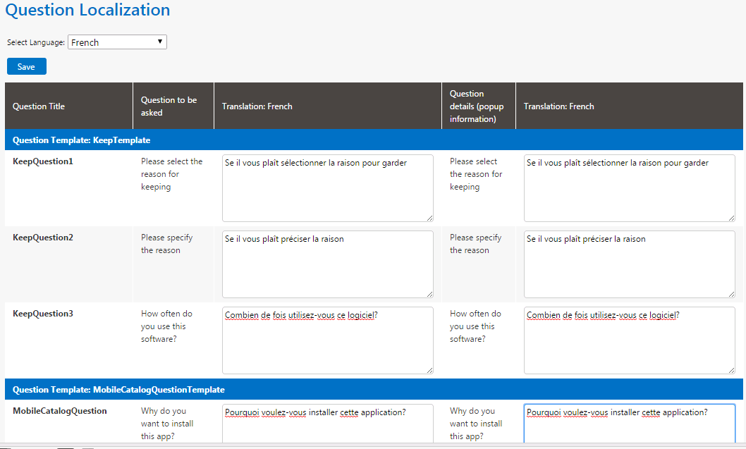 - From the   Select Language   list, select the activated language that you want to translate the questions for. The existing questions (and each question’s pop-up description) are listed.