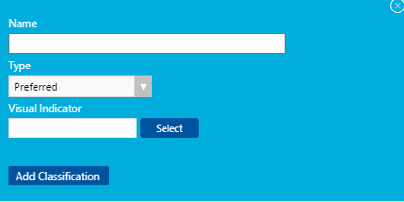 - Click Select button under Visual Indicator to add image. The image can be jpeg, gif, or png. Other formats are not supported. Only 1 image can be associated to a classification. The image size should be less than 1 MB.