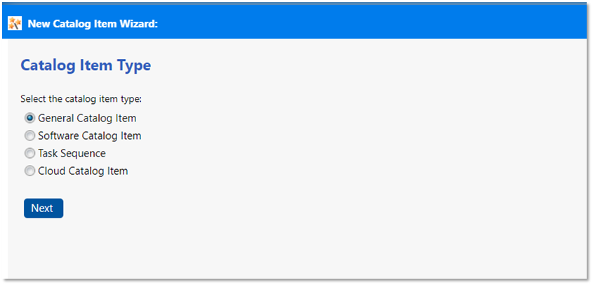- Under  Catalog Management , select   New Catalog Item Wizard  . The Catalog Item Type panel of the   New Catalog Item Wizard   opens.