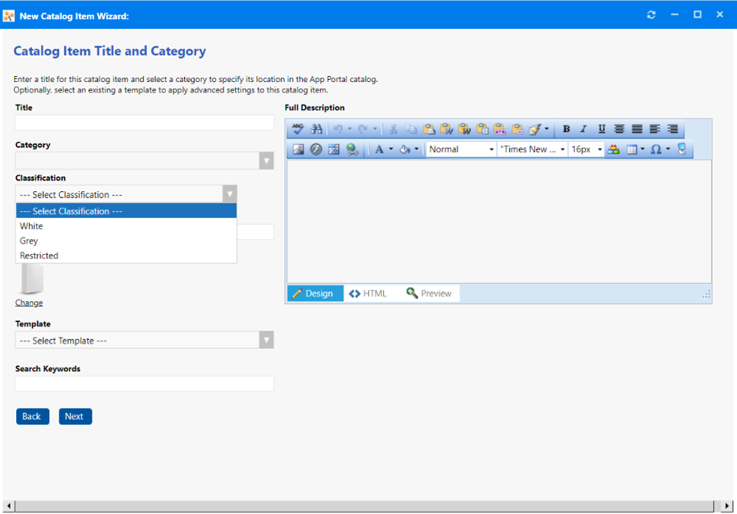 Classification property is only displayed for General, Software and Cloud types of catalog in the wizard. Classification is not shown for Task Sequence, OSD, Group and Mobile catalogs. Classification property is only shown if the global setting under Settings > Website > Catalog Classification is checked.