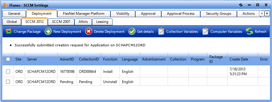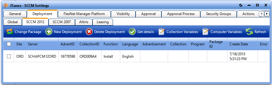 - Open the  Deployment > SCCM 2012  subtab that contains the catalog item’s associated application or package.