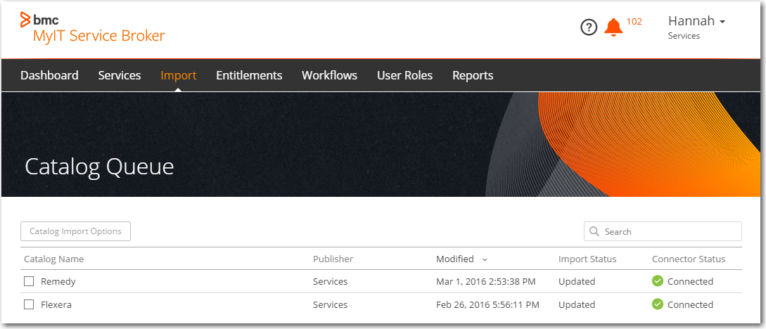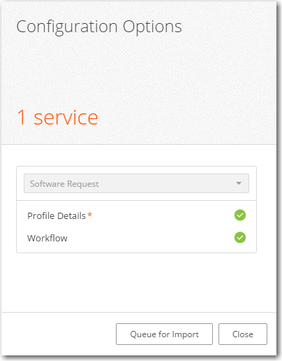 - Click the  Import 1 Item  button. The item is imported from App Portal to BMC MyIT, and the  Catalog Queue  page opens.