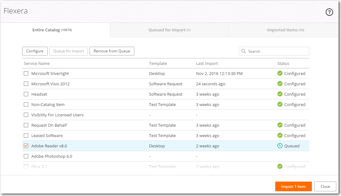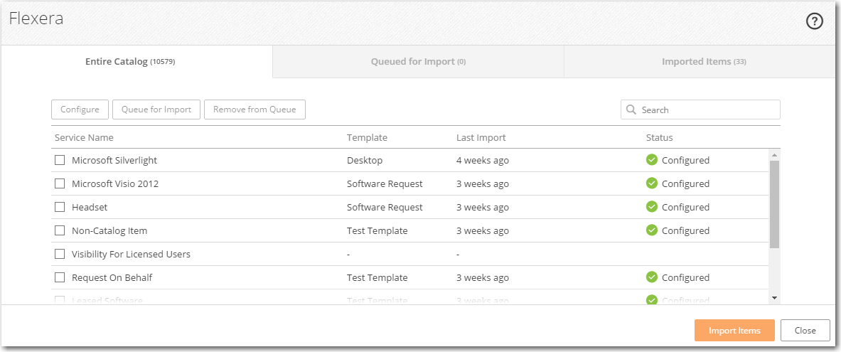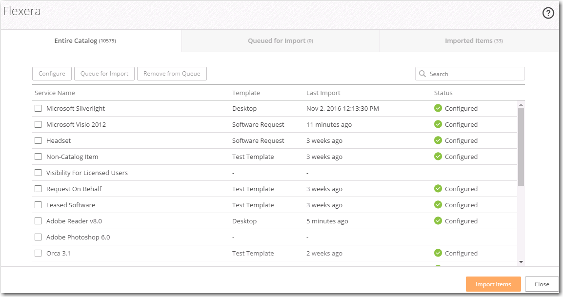 - Double click on    Flexera   . The   Entire Catalog   tab of the    Flexera    page opens, and the  Last Import  column of the catalog item lists the time period since the import (such as 5 minutes) and the   Status   column is changed to  Configured .