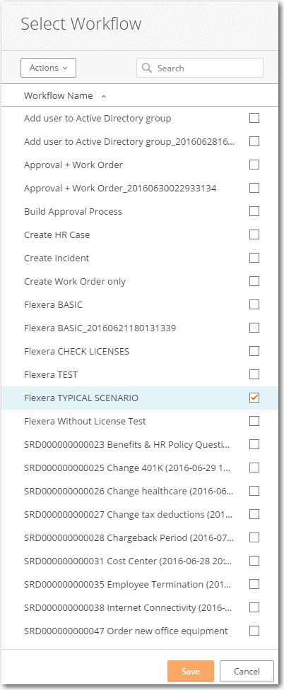 - Select a workflow, such as   Flexera TYPICAL SCENARIO  , and click    Save   .