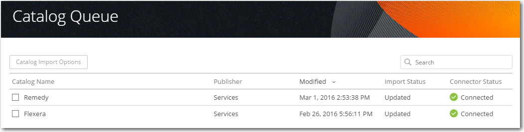- Select the name of your App Portal catalog (such as Flexera) and click the  Catalog Import Options  button. The   Entire Catalog   tab of the selected catalog page is displayed.