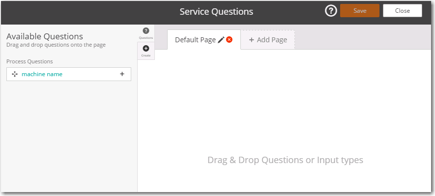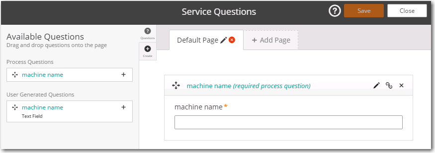 - Click    Save    to close the   Question Settings   view. The   Service Questions   view opens, displaying the  machine name  field.