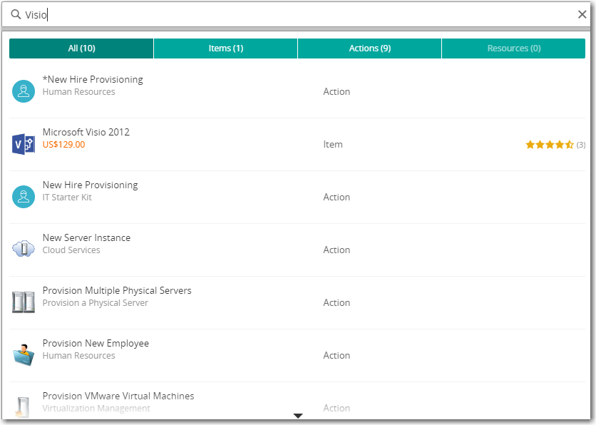 - Search for the published services (catalog items) by entering text in the  Search  text box. A list of search results appears in a pop-up dialog box: