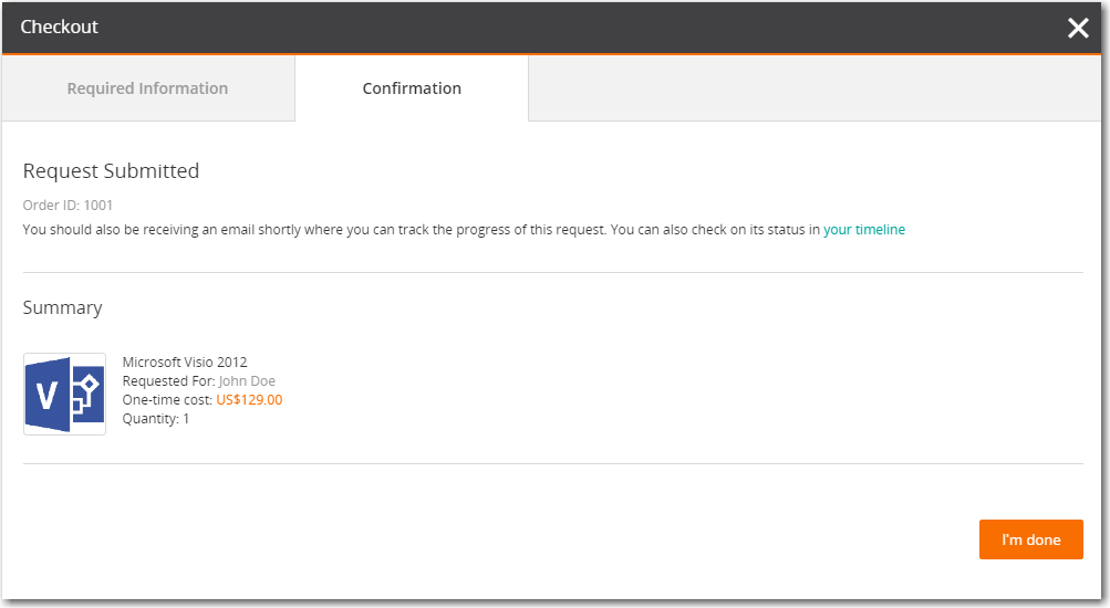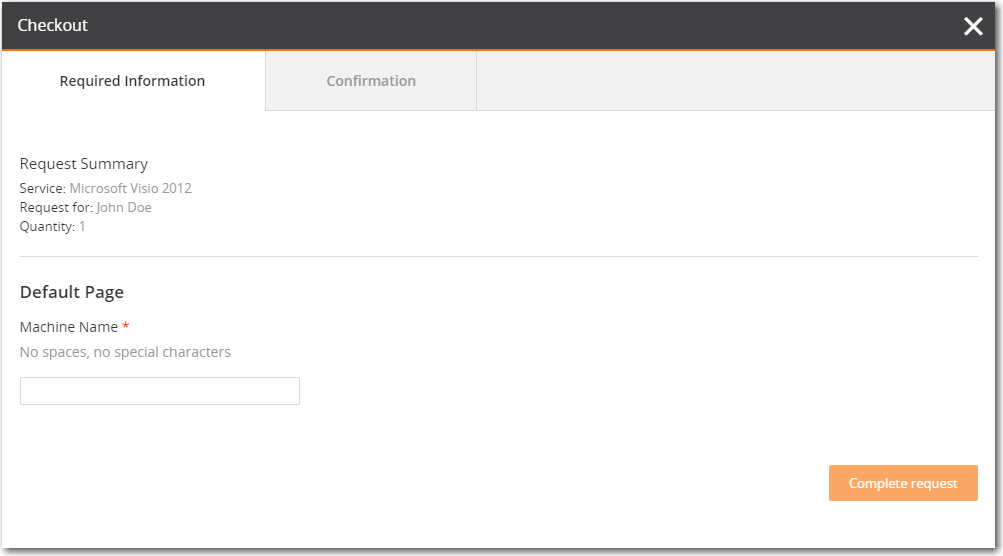 - Enter the  Machine Name  and click on the  Complete request  button. The  Confirmation  tab of the   Checkout   process opens and the  Request Submitted  message is displayed.