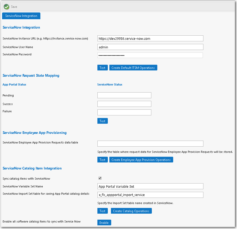 - If you are an existing App Portal customer who has already defined catalog items, you have to click the Enable button next to Enable all software catalog items to sync with ServiceNow to sync existing catalog items with ServiceNow. If you do not click this button, only new and updated catalog items will be synced with ServiceNow.