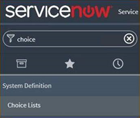 - Login to ServiceNow and search for "choice" in the navigation panel, and then select  System Definition > Choice Lists .