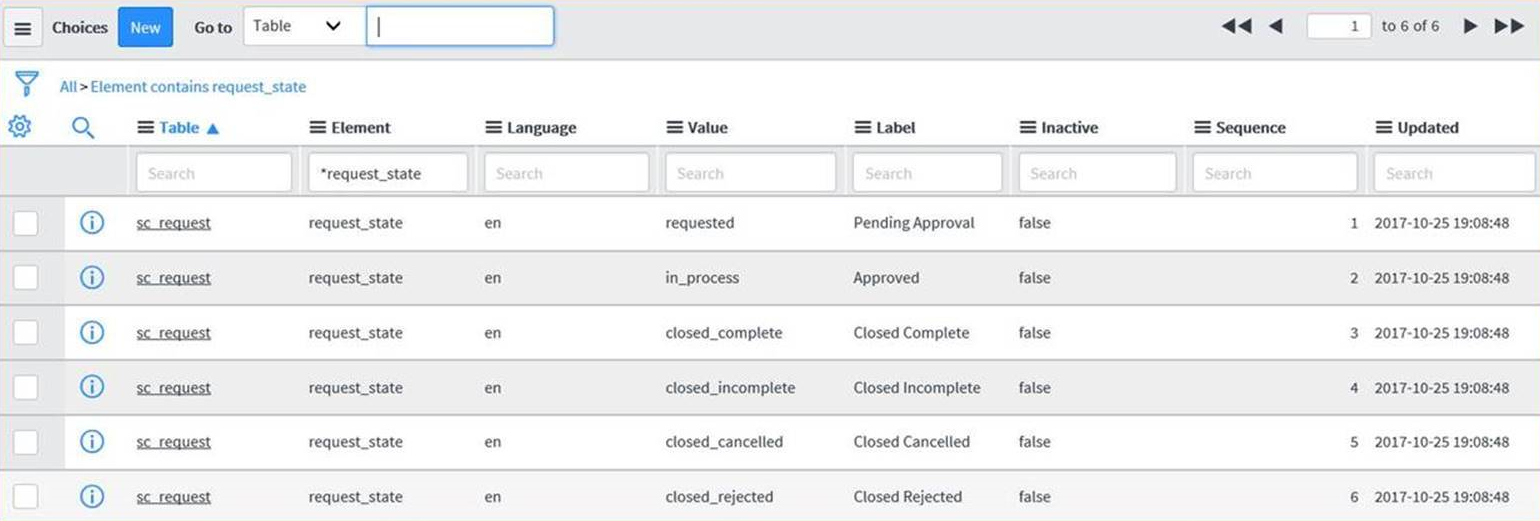 - Use the Element column filter to filter down to *request_state to display the valid choices in the Value column that map to the desired statuses in App Portal / App Broker.