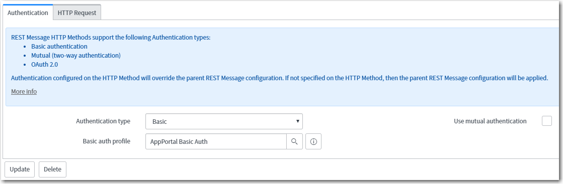 7. On the Authentication tab, set Authentication type as desired for your organization. By default, None will be selected. Select the authentication type that the selected ServiceNow MID server should use to access the App Portal REST API.