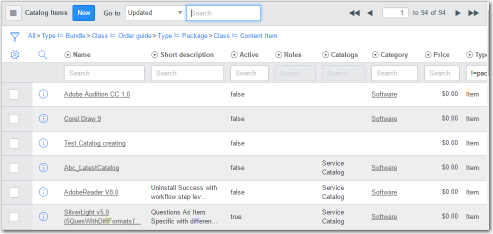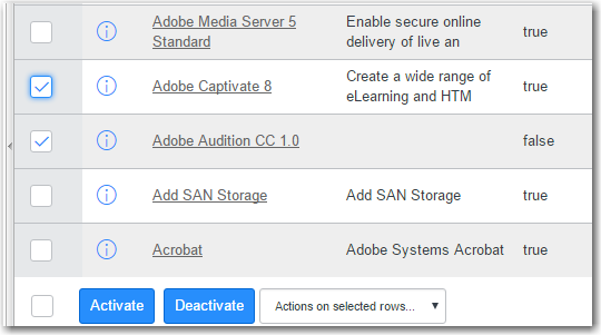 - To activate or deactivate a catalog item, select its check box in the list and then click the  Activate  or  Deactivate  button at the bottom of the list.