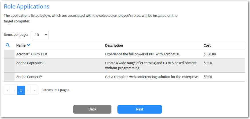 10. Click Next . The Role Applications panel opens, listing the applications that are associated with the selected employee’s roles, which will be installed on the target computer.