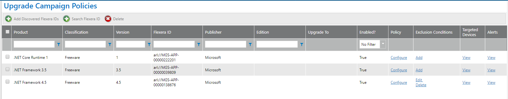 - To upgrade an application that could be installed in the future—To create a campaign to upgrade an application that could be installed in your enterprise in the future, click Search Flexera ID . The Search for FlexeraID view opens, listing all of the existing applications/versions in the FlexNet Manager Suite database.