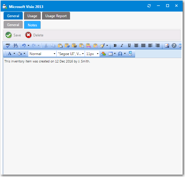 2. To optionally enter associated information about what the inventory item will be used for, open the General > Notes tab and enter a note.