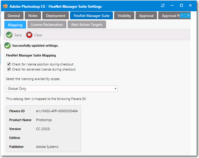 - Click    Save   . The catalog item is now mapped to a software entry in FlexNet Manager Suite, and the product information is now listed at the top of the dialog box.